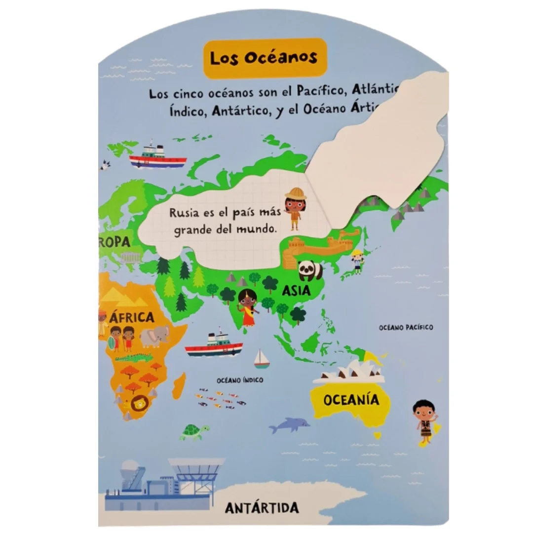 ¡Embárcate en un divertido viaje alrededor del mundo con este colorido Atlas! ¡Explora emocionantes tierras, conoce diferentes animales y descubre asombrosos lugares emblemáticos!